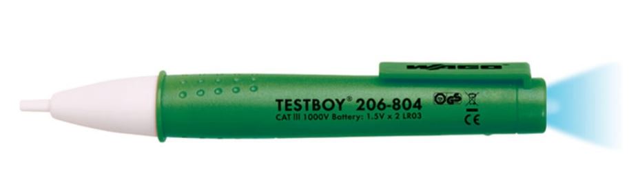 The WAGO Testboy 206-804 ist able to seek live wires out with the circuit integrated in the point. When recognizing an alternating voltage of 12 V AC, the white cop flashes up red and a warning tone rings out. A current flow is not necessary!