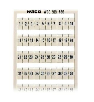 Wago, 209-566, WSB Marking Card, Horizontal Marking, Numbered 1-50 (x2), 5mm Wide, Snap-on Type, White, Card = 10 Strips Of 10 Markers Per Card