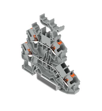 Our double-deck terminal block (item number 2202-2231) simplifies electrical installations. The double-deck terminal block also serves as a through terminal block. Ensure that the strip lengths are between 10 mm and 12 mm when connecting conductors to this double-deck terminal block. This product incorporates conductor terminals and utilizes Push-in CAGE CLAMP®. Our Push-in CAGE CLAMP® is a universal, maintenance-free connection solution for all conductor types, featuring a winning design: It allows direct insertion of both solid and fine-stranded conductors with ferrules without needing tools. No preparation is required; for example, crimping the conductor's ferrule is not necessary. This double-deck terminal block is suitable for conductor cross sections ranging from 0.25 mm² to 4 mm². It has two levels. Two potentials can connect using the four clamping points The gray housing is made of polyamide (PA66) for insulation. These through rail-mount terminal blocks are mounted using DIN-rails 35 x 15 or DIN-rails 35 x 7.5.. This product is designed for specific Ex applications (please refer to the product datasheet).