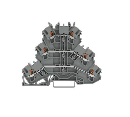 This triple-deck terminal block (item number 2202-3201) provides hassle-free electrical installations. The triple-deck terminal block also functions as a through terminal block. Strip lengths must be between 10 mm and 12 mm when connecting conductors to this triple-deck terminal block. This product features conductor terminals and utilizes Push-in CAGE CLAMP®. Push-in CAGE CLAMP® technology provides a universal connection solution for all conductor types. It allows both solid and fine-stranded conductors with ferrules to be inserted directly into the clamping point without the need for tools. This triple-deck terminal block is suitable for conductor cross sections ranging from 0.25 mm² to 4 mm². It has three levels. Three potentials can connect using the six clamping points The gray housing is made of polyamide (PA66) for insulation. These through rail-mount terminal blocks are mounted using DIN-35 rails.. This product is designed for specific Ex applications (please refer to the product datasheet).