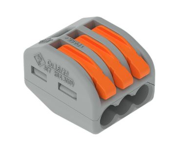 Splicing connector with levers (item number 222-413) simplifies electrical installations. From wiring intercom systems to installing electrical ovens, connecting different conductor types is quick and simple with WAGO's compact 222 Series splicing connector, which allows you to quickly and safely connect different types of conductors. This splicing connector has a rated voltage of 400 V and can handle currents up to 32 A, making it ideal for high-load applications. Conductors can only be connected to splicing connector with levers if their strip length is between 9 mm and 10 mm. This product features conductor terminals and utilizes CAGE CLAMP®. Our highly-rated and maintenance-free CAGE CLAMP® connection makes it easy to connect all conductor types without having to prepare the conductor. For example, you don't need to crimp ferrules. Dimensions: 17 x 14.5 x 20.5 mm (width x height x depth). Splicing connector with levers is suitable for conductor cross sections ranging from 0.08 mm² to 2.5 mm².
