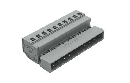 With this pin header (item number 231-610), clean electrical installation is the main focus. Rely on tried-and-tested safety when designing your device: PCB connectors offer a variety of application options. This pin header requires a stripping length of 8 to 9mm for the conductor connection. This product uses CAGE CLAMP® technology. The proven and maintenance-free CAGE CLAMP® universal connection enables the connection of all conductor types with a cage clamp. Pre-treatment of the conductors, e.g., by crimping on wire end ferrules, is not required. The dimensions are (width x height x depth) (53.2 x 14.3 x 27.5mm). Depending on the conductor type, the pin header is designed for conductor cross-sections from 0.08mm² to 2.5mm². The contact surface is tin. This pin header/connector is operated using an operating tool. WAGO's MCS – "Multi Connection System" – is a versatile connector system for your consistent system wiring. It enables simplified wiring in cable pre-assembly and on devices thanks to two actuation directions for the CAGE CLAMP® variants.
