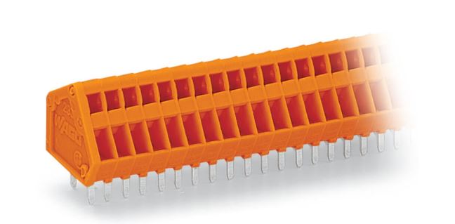 Our PCB terminal block (item number 233-408) makes connections quick and easy. It is a universal connector that can be used practically anywhere, e.g., as a pluggable PCB connector, panel feedthrough header, connector for rail-mount terminal blocks, or a floating connector for different mounting methods. This PCB terminal block has a rated voltage of 160V and can handle currents up to 6A. Strip lengths must be between 5mm and 6mm when connecting conductors to this PCB terminal block. Featuring one conductor terminal along with CAGE CLAMP®, this product delivers reliable performance. Our reliable and maintenance-free CAGE CLAMP® connection makes it easy to connect all types of conductors without having to prepare the conductor. For example, you don't need to crimp ferrules. The dimensions are 22.62 x 15.7 x 12.1mm (width x height x depth). This PCB terminal block is suitable for conductor cross sections ranging from 0.08 mm² to 0.5mm². It features one level and eight clamping points that you can use to connect eight potentials / 8 poles. The clamping spring is made of chrome-nickel spring steel (CrNi), the orange housing is made of polyamide (PA66) for insulation, and the contacts are made of electrolytic copper (ECu). Tin is used for coating the contact surfaces. This PCB terminal block is operated with an operating tool. The PCB terminal block is designed for THT soldering. The conductor is designed to be inserted at a 30° angle.. The solder pins, which are 0.5 x 0.75mm in cross-section and 4mm long, are set out over the entire terminal strip (in-line). There are two solder pins per potential.