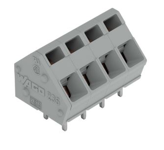 Our PCB terminal block (item number 236-404) is the perfect way to connect conductors quickly and securely. It is a universal connector that can be used practically anywhere, e.g., as a pluggable PCB connector, panel feedthrough header, connector for rail-mount terminal blocks, or a floating connector for different mounting methods. Our PCB terminal block is rated for 320V and is designed for use with a rated current of up to 24A. As such, it is suitable for high-load applications. Strip lengths must be between 5mm and 6mm when connecting conductors to this PCB terminal block. This product features one conductor terminal and utilizes CAGE CLAMP®. Our reliable and maintenance-free CAGE CLAMP® connection makes it easy to connect all conductor types without having to prepare the conductor. For example, you don't need to crimp ferrules. Dimensions: 22.3 x 17 x 14mm (width x height x depth). Depending on the conductor type, this PCB terminal block is suitable for conductor cross sections ranging from 0.08mm² to 2.5mm². It features one level and four clamping points for connecting four potentials / 4 poles. The gray housing is made of polyamide (PA66) for insulation, the clamping spring is made of chrome-nickel spring steel (CrNi), and the contacts are made of electrolytic copper (ECu). The contact surface is coated with tin. This PCB terminal block is operated with an operating tool. THT is used to assemble the PCB terminal block. The conductor is designed to be inserted into the board at a 45° angle.. The solder pins measure 0.7 x 0.7mm in cross-section and 4mm in length and are arranged over the entire terminal strip (in-line). There are two solder pins per potential.