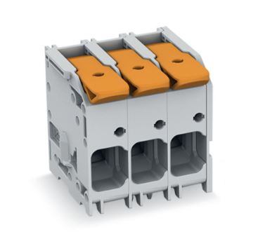 Connect conductors quickly and securely with this PCB terminal block (item number 2616-1103/020-000). It is a universal connector that can be used practically anywhere, for example, as a pluggable PCB connector, panel feedthrough header, connector for rail-mount terminal blocks, or a floating connector for different mounting methods. Our PCB terminal block is rated for 1000V and is designed for use with a rated current of up to 76A. It can therefore be used in high-load applications. Strip lengths must be between 18mm and 20mm when connecting conductors to this PCB terminal block. This product features one conductor terminal and utilizes Push-in CAGE CLAMP®. Push-in CAGE CLAMP® technology provides a universal connection solution for all conductor types. It allows both solid and fine-stranded conductors with ferrules to be inserted directly into the clamping point without the need for tools. The dimensions are 32.8 x 37.2 x 32mm (width x height x depth). This PCB terminal block is suitable for conductor cross sections ranging from 0.75mm² to 16mm². It features one level and three clamping points that you can use to connect three potentials / 3 poles. The gray housing is made of polyamide (PA66) for insulation, the contacts are made of electrolytic copper (ECu), and the clamping spring is made of chrome-nickel spring steel (CrNi). The contact surface is coated with tin. A lever is used to operate this PCB terminal block. THT is used to solder the PCB terminal block. The conductor is designed to be inserted into the board at a 0° angle.. The solder pins measure 1.2 x 1.2 mm in cross-section and 4 mm in length and are organized over the entire terminal strip (staggered). There are three solder pins per potential.