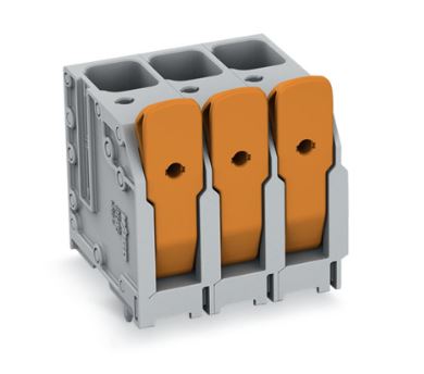 Our PCB terminal block (item number 2616-3103) ensures effortless electrical installations. It is ideal for custom installations with different mounting types. Our PCB terminal block is rated for 320V and is designed to handle a rated current of up to 76A. As such, it is suitable for high-load applications. Strip lengths must be between 18mm and 20mm when connecting conductors to this PCB terminal block. Featuring one conductor terminal along with Push-in CAGE CLAMP®, this product outperforms the competition. Our Push-in CAGE CLAMP® is a universal, maintenance-free connection solution for all conductor types, offering a key advantage: both solid and fine-stranded conductors with ferrules can be directly inserted without the need for tools or any preparation, such as crimping the ferrule. Dimensions: 32.8 x 38.2 x 29.4mm (width x height x depth). This PCB terminal block is suitable for conductor cross sections ranging from 0.75mm² to 16mm². Up to three potentials / three poles can be connected to this terminal strip using three clamping points on one level. The clamping spring is made of chrome-nickel spring steel (CrNi), the gray housing is made of polyamide (PA66) for insulation, and the contacts are made of electrolytic copper (ECu). The contact surface is coated with tin. A lever is used to operate this PCB terminal block. THT is used to solder the PCB terminal block. The conductor is designed to be inserted at an angle of 90°.. The solder pins, which are 1.2 x 1.2mm in cross-section and 4mm long, are laid out over the entire terminal strip (staggered). There are six solder pins per potential.