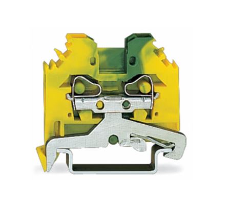 This ground terminal block (item number 281-107) is designed to connect conductors quickly and easily. Our ground terminal blocks allow you to connect electrical conductors directly to the mounting rail thanks to an integrated contact foot. This connection ensures both electrical and mechanical stability between the conductors and the mounting adapter. Strip lengths must be between 9mm and 10mm when connecting conductors to this ground terminal block. This product features conductor terminals and utilizes CAGE CLAMP®. Our highly-rated and maintenance-free CAGE CLAMP® connection makes it easy to connect all types of conductors without having to prepare the conductor. For example, you don't need to crimp ferrules. This ground terminal block is suitable for conductor cross sections ranging from 0.08mm² to 4mm². It features one level and two clamping points that you can use to connect a single potential. The green-yellow housing is made of polyamide (PA66) for insulation. An operating tool is used to operate this through rail-mount terminal block. These through rail-mount terminal blocks are mounted using DIN-35 rails.. The side-entry wiring allows you to connect copper, aluminum conductors.