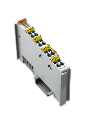 This analog input module directly connects to select Pt or Ni resistance sensors. It can only be operated as a 4-channel (2-wire) module. Its temperature range is restricted to −30 … +150 °C. The module automatically linearizes the entire temperature range. A sensor error (short circuit, line break or measurement range overflow) is indicated by a red LED. The module can be configured via WAGO-I/O-CHECK or GSD files. It features multiple setting options and high accuracy.