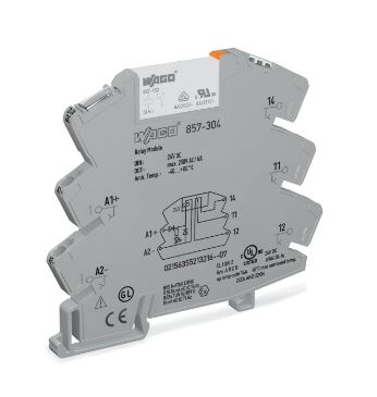 Wago, 857-304, 857 Series, 6mm Wide Relay Module, Input Voltage 24V DC, 1 x C/O Contact, 6 Amps @ 250V AC, Yellow Led Indication