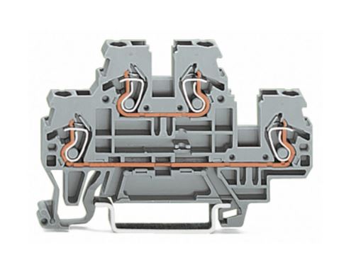 Easy electrical installations are guaranteed with this double-deck terminal block (item number 870-501). The double-deck terminal block also serves as a through terminal block. Ensure that the strip lengths are between 6 mm and 7 mm when connecting conductors to this double-deck terminal block. This product incorporates conductor terminals and utilizes CAGE CLAMP®. Our reliable and maintenance-free CAGE CLAMP® connection makes it easy to connect all conductor types without having to prepare the conductor. For example, you don't need to crimp ferrules. This double-deck terminal block is suitable for conductor cross sections ranging from 0.08 mm² to 2.5 mm². It has two levels. You can connect two potentials using the four clamping points. The grey housing is made of polyamide (PA66) for insulation. These through rail-mount terminal blocks are mounted using DIN-35 rails