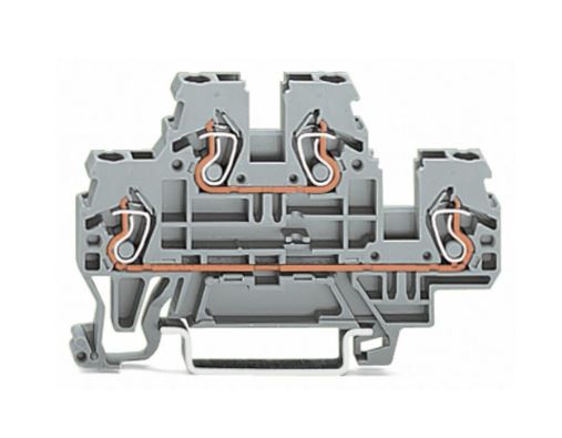 Easy electrical installations are guaranteed with this double-deck terminal block (item number 870-502). The double-deck terminal block also functions as a through terminal block. Ensure that the strip lengths are between 6 mm and 7 mm when connecting conductors to this double-deck terminal block. Featuring conductor terminals along with CAGE CLAMP®, this connector outperforms the competition. Our reliable and maintenance-free CAGE CLAMP® connection makes it easy to connect all types of conductors without having to prepare the conductor. For example, you don't need to crimp ferrules. Depending on the type of conductor, this double-deck terminal block is suitable for conductor cross sections ranging from 0.08 mm² to 2.5 mm². It features two levels and four clamping points that you can use to connect two potentials. The gray housing is made of polyamide (PA66) for insulation. These through rail-mount terminal blocks are mounted using DIN-35 rails.