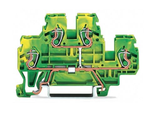 This double-deck terminal block (item number 870-507) provides seamless electrical installations. The double-deck terminal block also serves as a ground terminal block. Conductors should only be connected to this double-deck terminal block if their strip length is between 6 mm and 7 mm. This product features conductor terminals and utilizes CAGE CLAMP®. Our CAGE CLAMP® connection offers a secure and maintenance-free way to connect all types of conductors. You do not need to prepare the conductor in any way, such as crimping ferrules. This double-deck terminal block is suitable for conductor cross sections ranging from 0.08 mm² to 2.5 mm². It features two levels and four clamping points that you can use to connect a single potential. The green-yellow housing is made of polyamide (PA66) for insulation. These through rail-mount terminal blocks are mounted using DIN-35 rails..