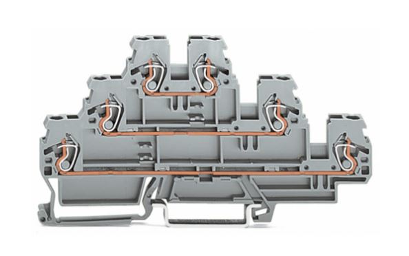 Our triple-deck terminal block (item number 870-551) simplifies electrical installations. The triple-deck terminal block also functions as a through terminal block. Strip lengths must be between 6 mm and 7 mm when connecting conductors to this triple-deck terminal block. This product features conductor terminals and utilizes CAGE CLAMP®. Our highly-rated and maintenance-free CAGE CLAMP® connection makes it easy to connect all conductor types without having to prepare the conductor. For example, you don't need to crimp ferrules. This triple-deck terminal block is suitable for conductor cross sections ranging from 0.08 mm² to 2.5 mm². It has three levels. You can connect three potentials using the six clamping points. The gray housing is made of polyamide (PA66) for insulation. These through rail-mount terminal blocks are mounted using DIN-35 rails.