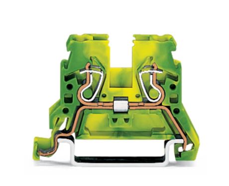 This ground terminal block (item number 870-907) is designed for quick and simple connections. Our ground terminal blocks create a direct connection between the mounting rail and the electrical conductors thanks to an integrated mounting foot. This connection ensures both electrical and mechanical stability between the conductors and the mounting adapter. Conductors can only be connected to this ground terminal block if their strip length is between 6 mm and 7 mm. This product features conductor terminals and utilizes CAGE CLAMP®. Our tried-and-tested universal connection known as CAGE CLAMP® is the industry standard for connection technology and electrical interconnections. Depending on the conductor type, this ground terminal block is designed for conductor cross sections ranging from 0.08 mm² to 2.5 mm². It has one level. You can connect a single potential using the two clamping points. The green-yellow housing is made of polyamide (PA66) for insulation. This mini rail-mount terminal block is operated with an operating tool. These mini rail-mount terminal blocks are mounted using DIN-35 rails.. The front-entry wiring allows you to connect copper conductors.